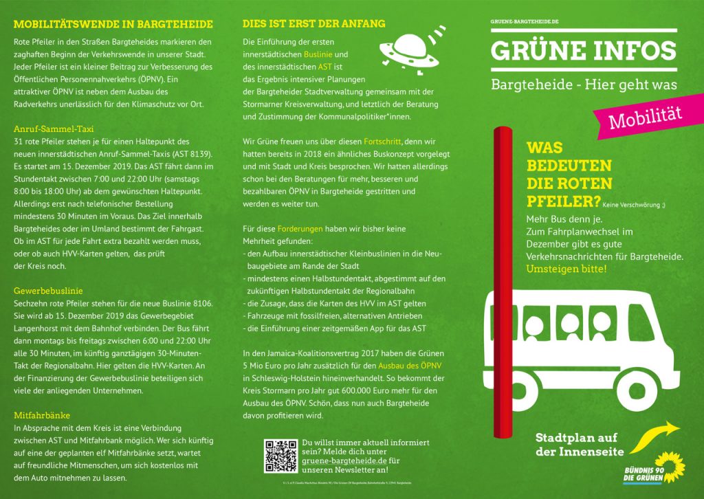Rechtzeitig zum zehnten Geburtstag machen die Bargteheider Grünen sich und den Bürgerinnen und Bürgern mit einem Info-Flyer ein Geschenk. „Immer wieder haben uns die Leute angesprochen und gefragt, was denn die roten Pfeiler am Straßenrand an vielen Stellen der Stadt bedeuten“, erläutert Ruth Kastner, Fraktionsvorsitzende der Grünen.
