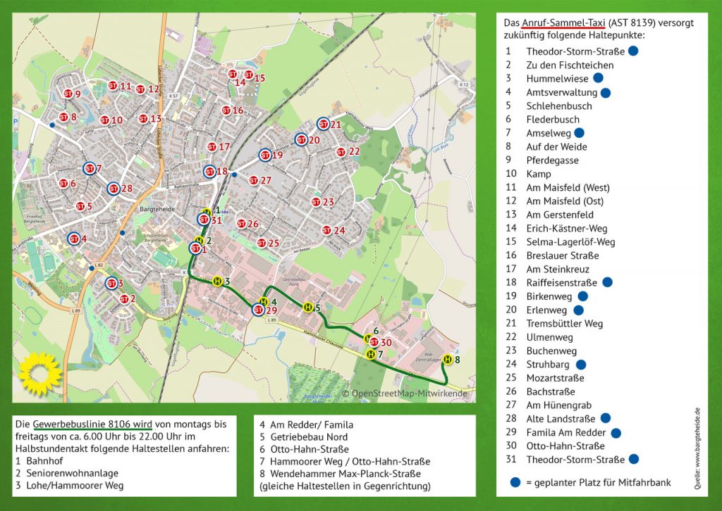 Die Antwort macht Freude: jeder Pfeiler ist ein Haltepunkt für ein neues innerstädtisches Anruf-Sammel-Taxi und eine neue Buslinie ins Gewerbegebiet Langenhorst, die ab 15. Dezember ihren Dienst aufnehmen. Eine Liste mit den 47 Haltepunkten steht jetzt auch auf der Homepage der Stadt. „Wir haben die Haltepunkte zur Orientierung in den Bargteheider Stadtplan eingetragen, Infos dazu gestellt und als Flyer gedruckt. Den kann man sich leicht an die Pinnwand heften.“