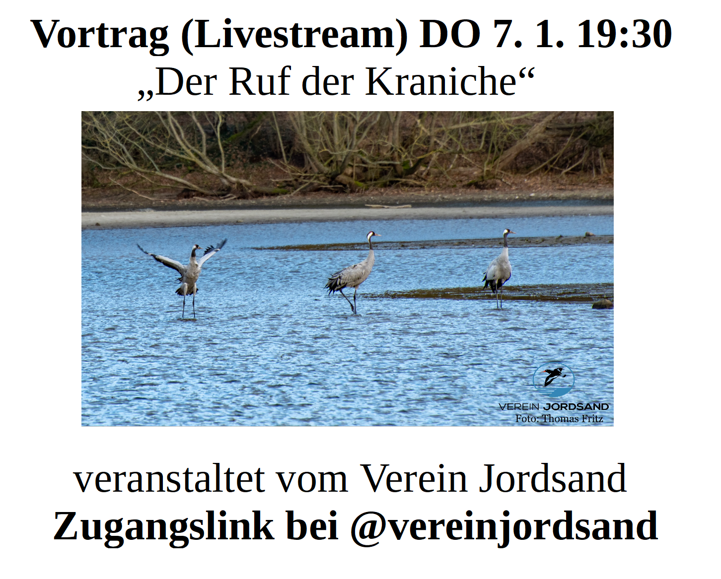 07.01.2020 um 19.30 Uhr, mit dem Vortrag „Der Ruf der Kraniche“ von Dr. Bernhard Weßling. Dr. Weßling erzählt von Kranichschutzprojekten und seiner jahrzehntelangen Forschung an Kranichen, die im Duvenstedter und Hansdorfer Brook begann und dann immer internationaler wurde. Der Vortrag findet diesmal aufgrund der Corona-Pandemie nicht im Haus der Natur in Ahrensburg statt, sondern wird live auf der Internetseite des Vereins www.jordsand.de gestreamt.