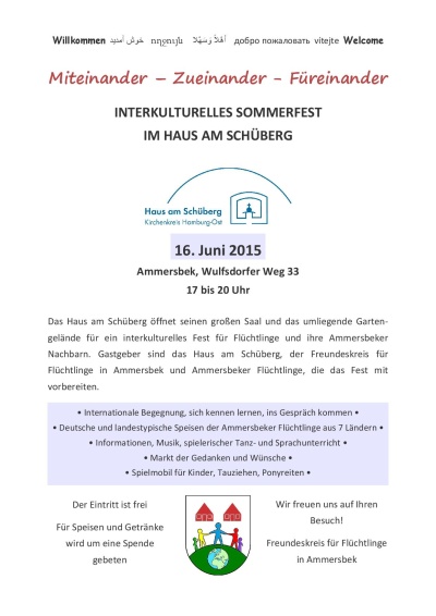 Ammersbek – Zu einem bunten, fröhlichen Sommerfest für Ammersbeker Flüchtlinge, ihre Nachbarn und Unterstützer laden das Haus am Schüberg, der Freundeskreis und die Flüchtlinge herzlich ein. Saal und Garten mit Kunstskulpturen bieten einen schönen Rahmen für ein nachbarschaftliches Begegnungsfest. Unter dem Motto „Miteinander, Zueinander, Füreinander“ können alteingesessene und neue Ammersbeker zusammen das bunte Bufett mit landestypischen Speisen aus 7 Ländern genießen, sich ungezwungen kennen lernen und bei hoffentlich schönem Wetter gemeinsam Freude an den internationalen Musik, Spiel- und Spaß-Angeboten haben. In kleinen lustigen Kurssequenzen können interessierte Besucher erste Worte in einer ihnen völlig fremden Sprache lernen, so wie es die Flüchtlinge bei uns im Deutschunterricht tun. Zum Thema Flüchtlinge und wie man sich auf vielfältige Weise für Integration und gutes Miteinander einsetzen kann, bietet der Freundeskreis für Flüchtlinge in Ammersbek Informationen, Gespräche und Mitmach-Angebote.