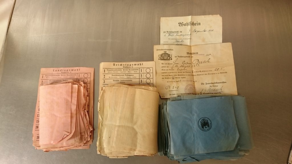 Im Jahr 2016 hat Herr Helmut Laudan dem Gemeindearchiv Ammersbek nach einer Haushaltsauflösung zwei Kartons mit Unterlagen aus dem Nachlass des ehemaligen Bürgermeisters Münch übergeben, der in den 1934 – 1944er Jahren für Hoisbüttel ehrenamtlich tätig war. Die Unterlagen stammen aus der Zeit der Münch- Vorgänger aus den 1920er Jahren sowie aus der aktiven aktiven Zeit von Erwin Münch aus den 1930er Jahren. Es handelt sich um offizielle Gemeindeunterlagen wie Gemeindeprotokolle, Prüflisten, Wahllisten, handschriftliche Briefe etc. Diese Unterlagen fehlten bislang im Bestand des Gemeindearchivs Ammersbek und damit für die Überlieferungsbildung des Ortes Hoisbüttel. Dass sie in Privatbesitz die Zeit überdauert haben und nun im Besitz des Gemeindearchivs sind, ist ein großer Glücksfall für die Überlieferung der geschichtlichen Entwicklung von Hoisbüttel.