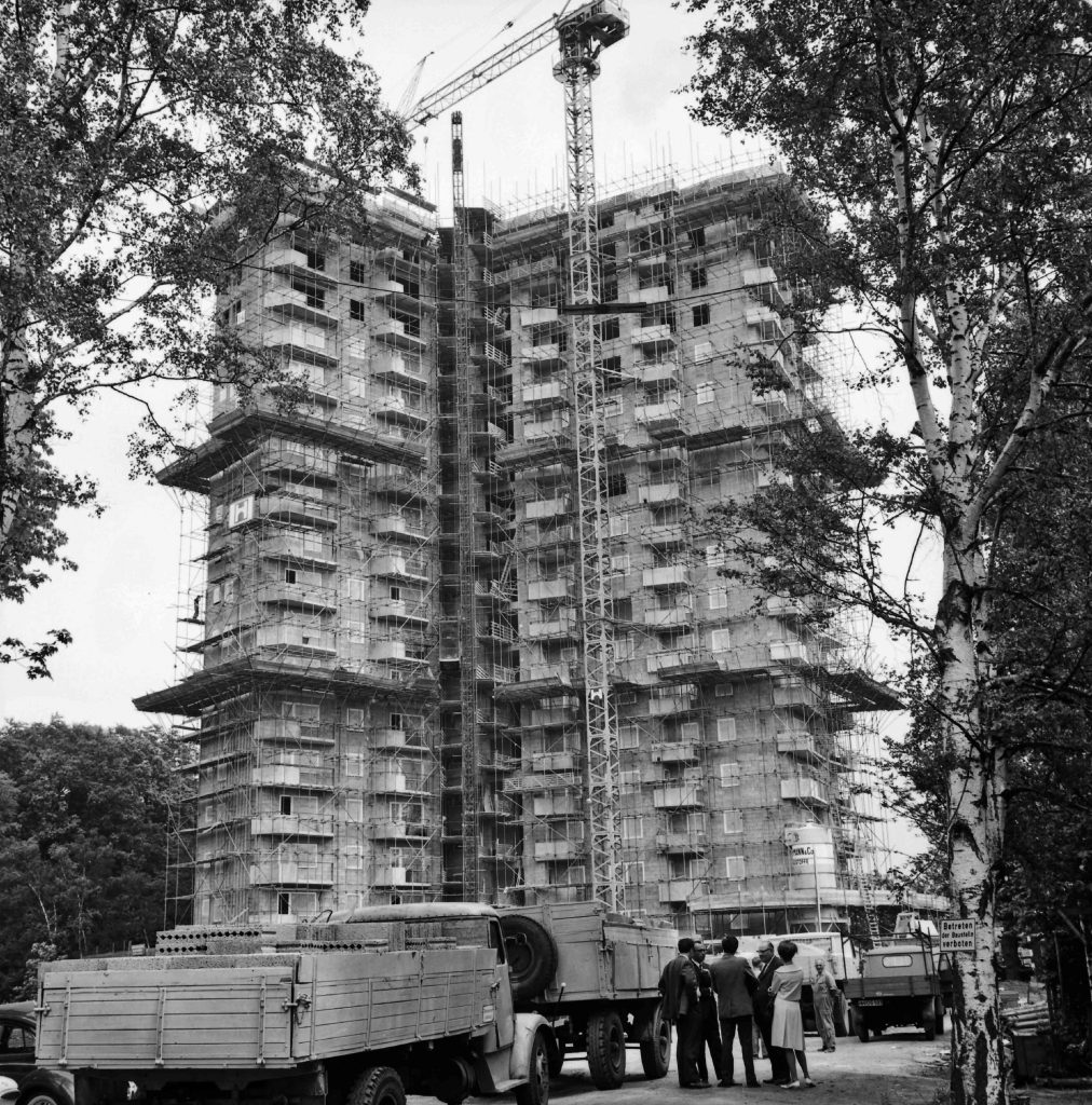 Hamburger Straße: Rohbau vor Richtfest: Besichtigung mit dem Architekten Max Haimerl: unten rechts Besuchergruppe: dahinter sowie links und rechts Lkws mit Baumaterial: hinten Mitte vor Gebäude Baukran: rechts und links Bäume, 1965