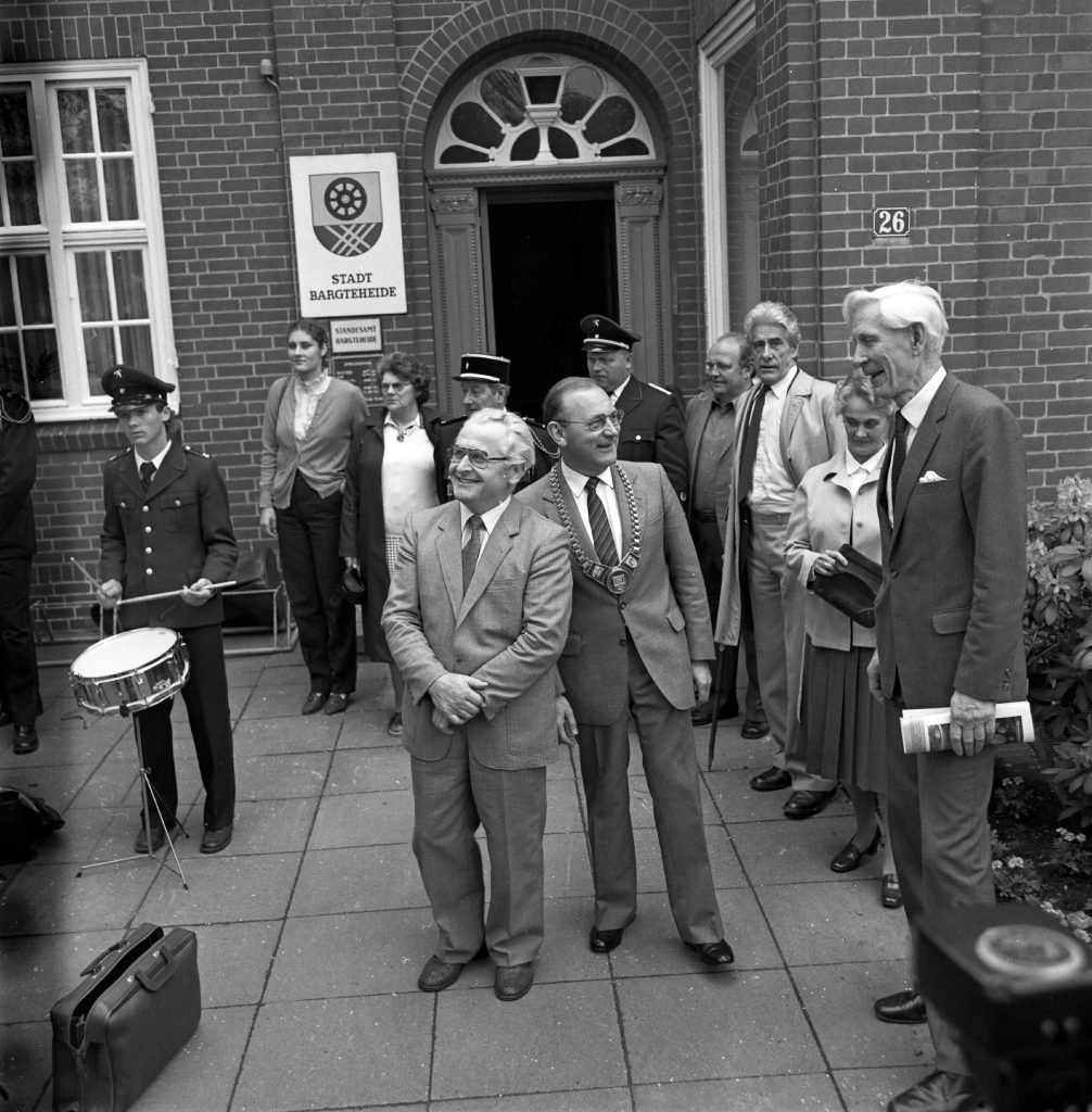 vor Rathausportal: Bürgermeister Erich Reinke mit Amtskette, Bürgervorsteher Kurt Iden, Stadtrat Erwin Gülde, Hans Schulze-Helmke vom Ring Bargteheider Kaufleute e.V., Wehrführer der Freiwilligen Feuerwehr Hans-Uwe Görtz, Trommler von Feuerwehrkapelle: hinten Bargteheider Stadtwappen, 28. Mai 1983