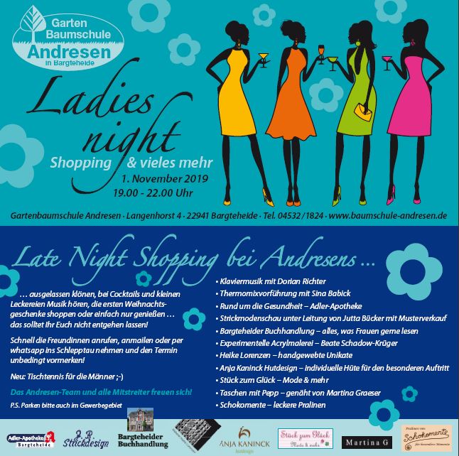 Am 1. November lädt die Gartenbumschule Andresen von 19 – 22 Uhr wieder zur beliebten Ladies Night mit Late Night Shopping ein.