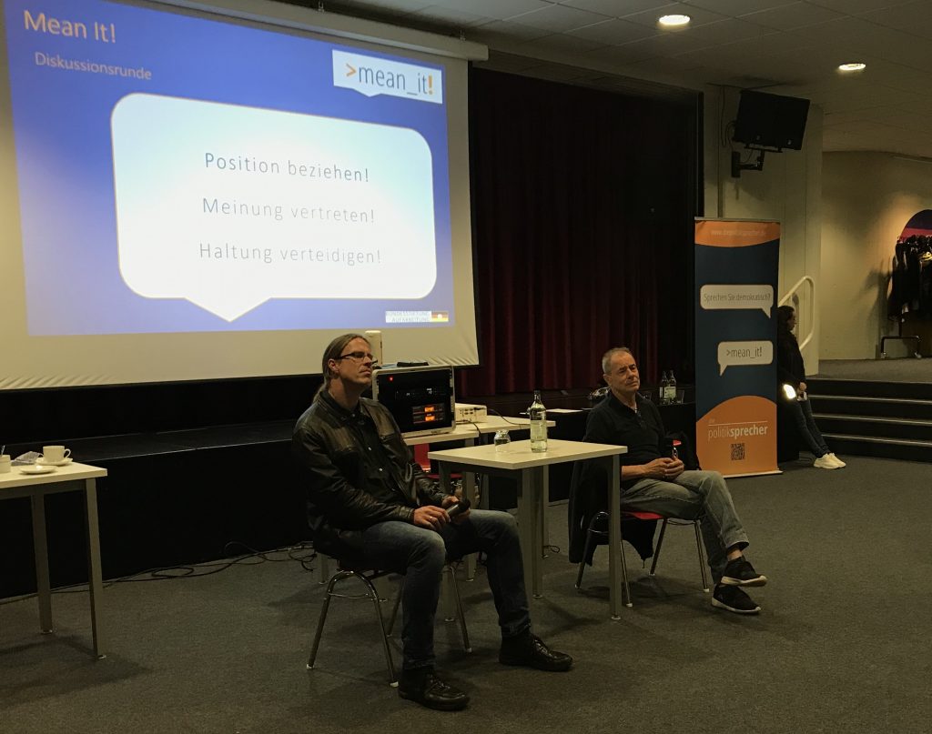 „Mean It!“ soll junge Menschen für die demokratische Debatte begeistern. Dafür wurden für den Projekttag von dem Verein „die politiksprecher“ unter der Leitung von Helge Eikelmann Diskussionspartner eingeladen, die mit den SchülerInnen ins Gespräch kamen: darunter der Richter Gunnar Ullrich, der am Landgericht Lübeck arbeitet und der Zeitzeuge Wolfgang Thüne, der als Kunstturner in der DDR im Spitzensport tätig war und von seinen Erlebnissen in der DDR berichtete. Auch das Thema Überwachung, staatliche Eingriffe in die Privatsphäre und Flucht aus der DDR spielten in der Diskussions- und Fragerunde eine Rolle. Was es bedeutet, wenn Meinungen gefährlich werden und Menschen ihre Freiheit einfordern, konnte durch die Berichte des Zeitzeugen Wolfgang Thüne somit eindrucksvoll ergänzt werden.