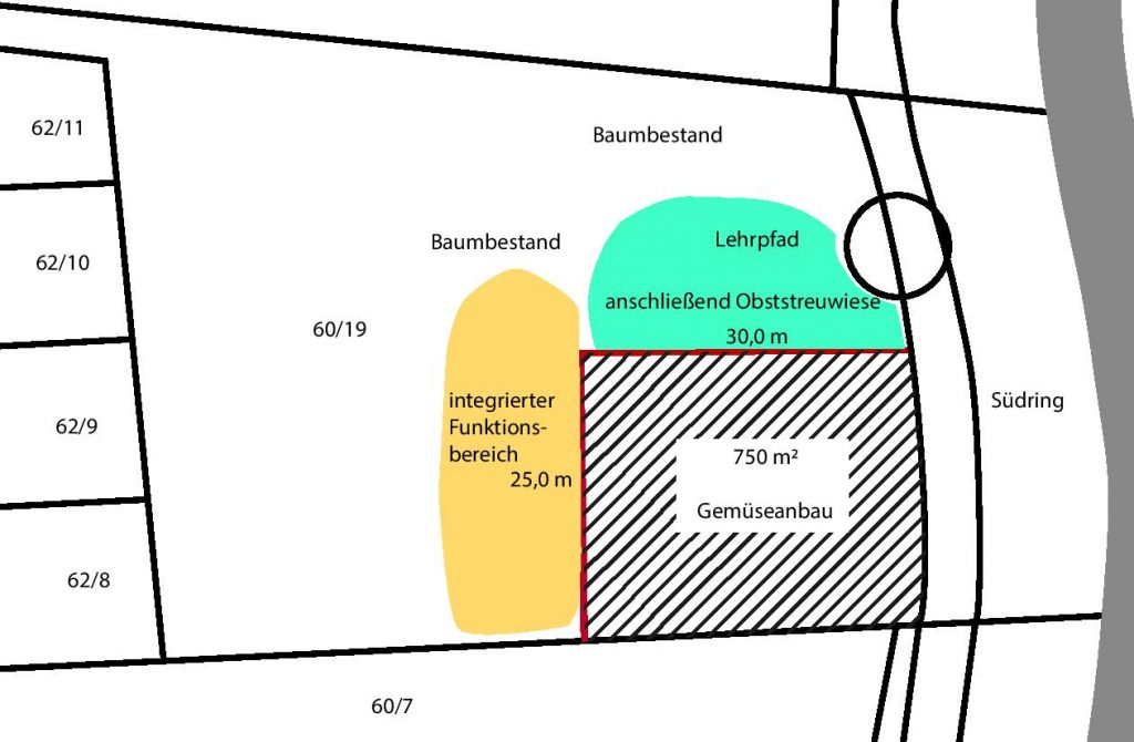 Im Bezug auf den zeitlichen Ablauf wird vom Stadtvertreter Mairhöfer in der Presse behauptet, der Beschluss zum Fällen der Bäume sei früher und völlig unabhängig von einem möglichen Standort am Südring für’s „urban gardening“ ergangen. Das ist falsch. Es hat nie einen politischen Beschluss zur Fällung der Bäume gegeben. Dem Umweltausschuss wurde am 30.9.2020 lediglich über eine „Bestandssicherung, Läuterung und Pflegemaßnahmen“ auf dem Areal berichtet. Zum anderen war ein Antrag auf Fördergelder für das „Stadtgärtnern“ schon spätestens im Sommer 2020 von der Verwaltung eingereicht worden. Die Ablehnung lag bereits im Herbst 2020 vor. Im Text zum Wettbewerb wird die Lage und Nutzung des Grundstücks 60/19 genau beschrieben und es wird für das Stadtgärtnern eigenmächtig von der Verwaltung zur Verfügung gestellt. Die politischen Gremien waren nicht informiert. Zur Beschreibung gehörte auch eine Handskizze, auf der die Areale für Gemüseanbau, Obststreuwiese usw. erkennbar sind. Aus urheberrechtlichen Gründen wurde sie zur Illustration maßstabsgetreu nachgezeichnet.