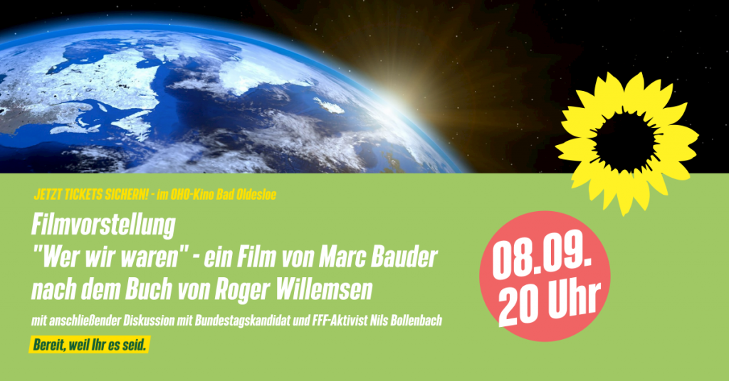 Was werden zukünftige Generationen über uns denken? Diese Frage wird von Astronauten, Ozeanbiologen, und Ökonomen im Kinofilm „Wer wir waren“ untersucht. Im Anschluss an die Filmvorführung laden die Bad Oldesloer Grünen zur Diskussion ein: Wie können wir es schaffen, durch eine intelligente Klimapolitik die Weichen so zu stellen, dass wir einen lebenswerten Planeten für unsere Kinder und Enkelkinder hinterlassen? Ein hoch brisantes Thema – denn wie zukünftige Generationen über uns denken werden, wird sicherlich stark davon abhängen, wie gut und wie schnell uns die klimaneutrale und sozial gerechte Modernisierung unserer Gesellschaft gelingt. Wir stellen die grünen Klimaschutzkonzepte vor – diskutieren Sie mit unserem Fridays for Future-Aktivisten und grünem Direktkandidaten Stormarn-Segeberg Nils Bollenbach.