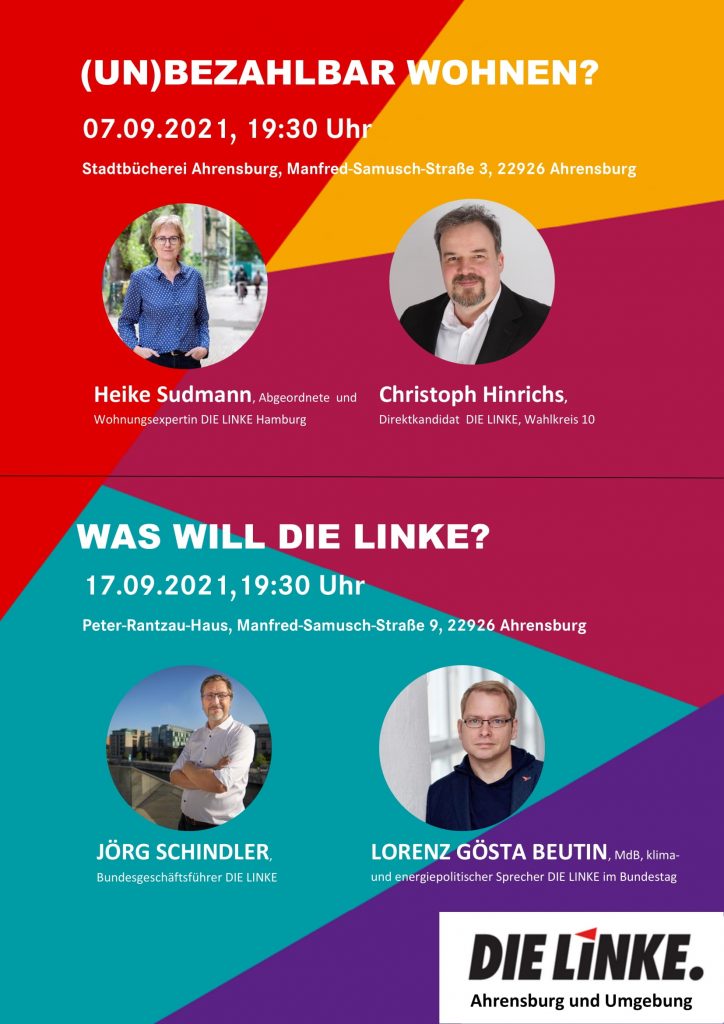 Am 17.09. lädt DIE LINKE Ahrensburg zu einer Veranstaltung mit Jörg Schindler, dem Bundesgeschäftsführer der LINKEN und Lorenz Gösta Beutin, dem klima- und energiepolitische Sprecher der LINKEN im Bundestag und Platz 2 der Bundestagsliste der LINKEN Schleswig-Holstein nach Ahrensburg ins Peter-Rantzau-Haus um über die