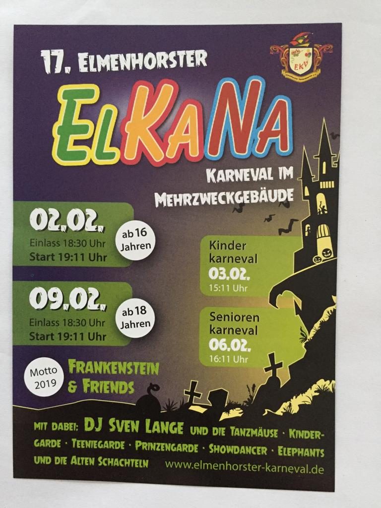 Die Elmenhorster Karneval Nacht(ELKANA) 1 und 2, am 02.02.2019 und am 09.02.2019, bietet jungen und junggebliebenen Gästen die Möglichkeit, bunt kostümiert in fröhlicher Runde den Garden, Prinzenpaaren , „Alten Schachteln“, Showdancern und „Elephants“ zu zu schauen und auch selber das Tanzbein zu schwingen. Kulinarisch bewirtet durch das Team Sesiani, musikalisch begleitet von DJ Sven Lange.