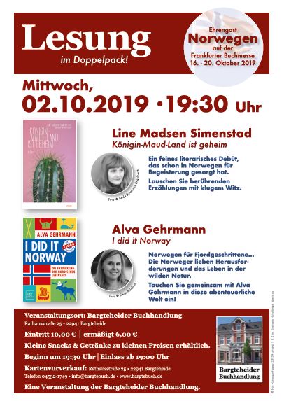 AktuellAllgemeinGesellschaftKunst & KulturTermine Lesung im Doppelpack in der Bargteheider Buchhandlung Von mac - Sep. 26, 2019 0 Gleich zwei Autorinnen lesen am kommenden Mittwoch aus Ihren Romanen in der Bargteheider Buchhandlung.