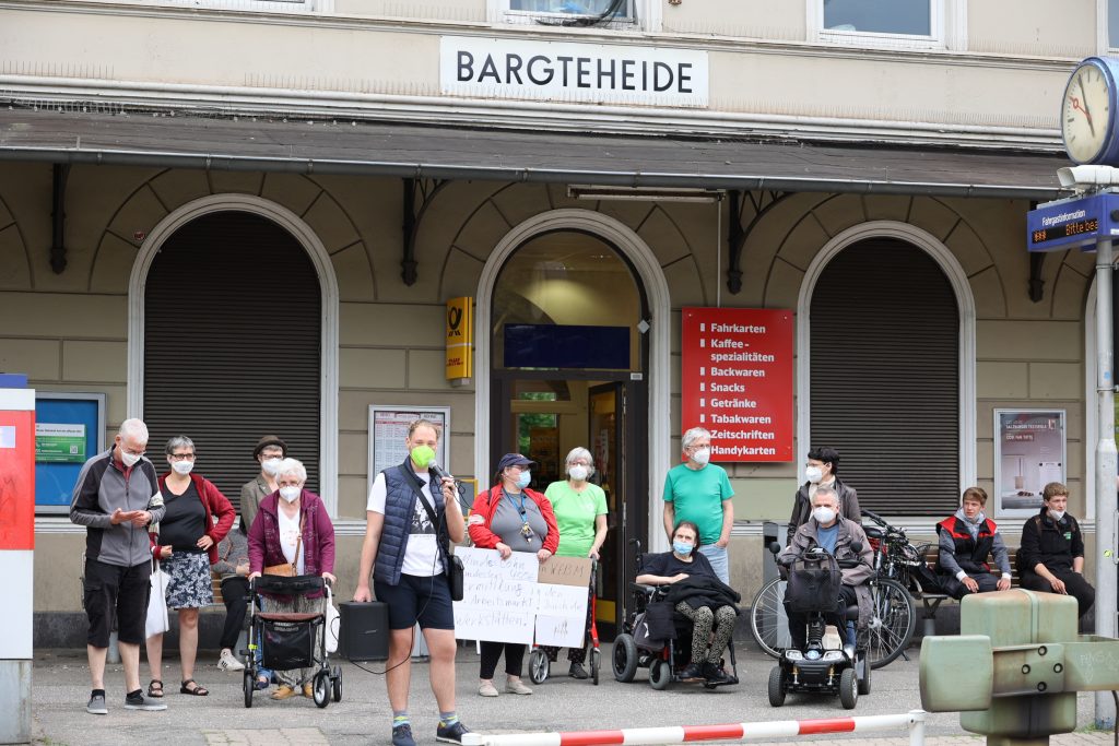 Für mehr Barrierefreiheit demonstrierte jetzt ein gutes Dutzend Menschen in Bargteheide. Schwer passierbares Kopfsteinpflaster, Ampeln ohne Tonsignal und ein Mindestlohn in den Werkstätten für Menschen mit Behinderung gehörten zu ihren Forderungen. Ziel der Demo mit Start vorm Rathaus war natürlich der Bahnhof. Denn dort sind die Barrieren besonders massiv.